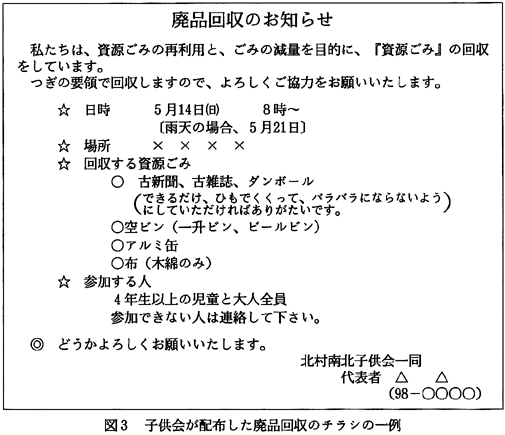 につき5円である。廃品回収日や回数は子ども会によって異なるが、多くの場合、季節の変わり目の日曜日に年2〜4回行っている。廃品回収のしくみは、まず、町長宛に「資源ごみ回収実施届け書」を提出する。届け書に記載される事項は、届出日、団体名、その住所、代表者、連絡先電話番号、回収地域、回収対象戸数、回収開始日、回収予定回数(年)、回収予定業者名、資源ごみ集積場所と付近見取り図、である。それぞれの回収日時に関しては、そのつどチラシを配るなどして子ども会の会員に知らせる。チラシの一例を紹介しておく(図3)。実物はB5版縦書きの用紙に子どもが手書きしたもので、かわいいカットが入っている。