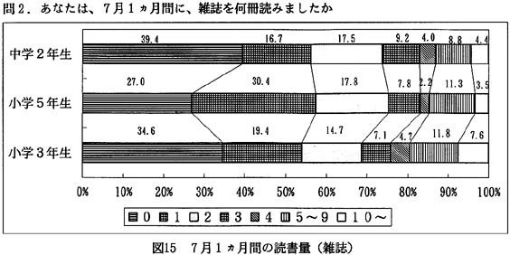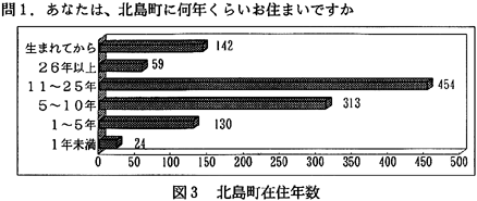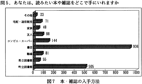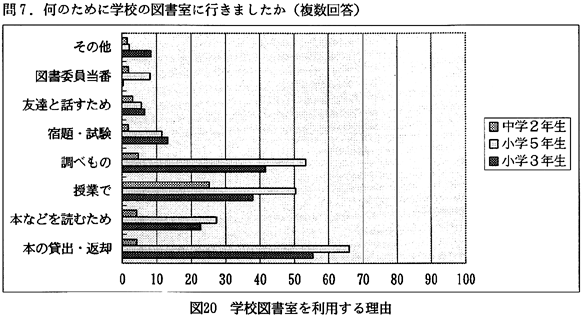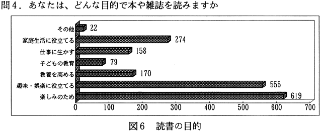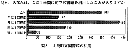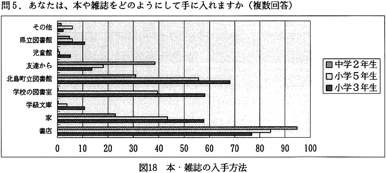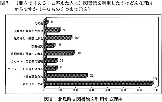 分析:町内在住年数は、11年〜26年と長く住んでいる人が多いが、近年、北島町では徳島市のベッドタウン化が進んでいるためか、1〜5年や5〜10年の人も多い(図3)。読書状況については、本を月に1〜2冊、雑誌を2〜3冊読むのが平均になっている(図4、5)。読書目的では、本や雑誌を、楽しみや趣味ととらえている人が多いのがわかる(図6)。ところで、本や雑誌の入手方法であるが、「書店から」が第1位になっている。注目したいのは、第2位に「町立図書館から」があがっていることである(図7)。次にこの1年間に町立図書館を利用した回数を尋ねてみた。全回答者の70%は利用したことがあり、そのうちの約5割の人は月に1回のペースで図書館を利用している(図8)。図書館を利用するいちばん多い理由は、「本を借りるため」であり、至極当たり前だが、実は図書館がうまく機能していることのあらわれかもしれない(図9)。逆に、町立図書館を一度も利用したことのない人々の図書館を利用しないいちばん大きな理由は、「開館時間に利用できないから」であった(図10)。北島町立図書館以外の読書施設は、利用してない人が圧倒的に多く、県立図書館や近隣の町立図書館は利用が少ない(図11)。町民の北島町立図書館への依存度が高いといえるかもしれない。公共図書館の存在価値については、「多少価値がある」を含めて、94%の人が価値を認めている(図12)。 2)児童・生徒へのアンケート