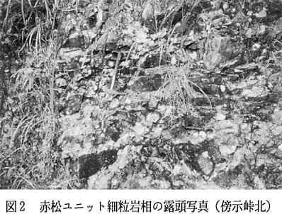 筆者らは、岩相に基づき、北から赤松、日和佐、明丸の三つのユニットに区分した。各ユニットは走向性断層で画される。それぞれのユニットでは北上位の同斜構造が支配的であるが、北の日和佐ユニットから南の明丸ユニットへと、地層の年代が若くなる極性がある。付加体形成に伴う走向性の断層は各ユニット内にも発達し、小規模な褶曲も存在する。赤松ユニットと日和佐ユニットは深瀬断層(公文、1981)で、日和佐ユニットと明丸ユニットも断層で接している。赤松ユニットは、調査地域北部に位置する最も古い付加コンプレックスである。遠洋〜半遠洋性堆積物と陸源砕屑性堆積物が、基本的に交互に繰り返して分布する。日和佐ユニットは中央部を東西に分布し、陸源砕屑性の粗粒堆積物を主とするコンプレックスである。明丸ユニットは、南部の海岸沿いにわずかに分布し、主に遠洋〜半遠洋性堆積物から成る最も若い付加コンプレックスである。 2)各ユニットの岩相 (1)赤松ユニット 赤松ユニットは、調査地域の北部、日和佐町大戸から赤松、八郎山にかけて東西に長く分布する。泥岩勝ち互層・泥岩・成層砂岩からなり、緑色岩類・チャート・酸性凝灰岩(図2、3)を伴う。