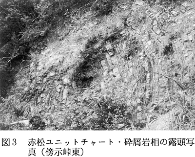 以下のレンズ状のチャートを伴う黒色珪質粘土岩(2m)、黒色の珪質頁岩(2m)、鱗片状劈開(へきかい)をもつ黒色泥岩(2m)の順に整合的に漸移する。このような遠洋〜半遠洋性堆積物からなるシーケンスは、海洋プレート層序に典型的なものである。 赤松ユニットにおいては、上記の海洋プレート層序を形成する遠洋〜半遠洋性堆積物に始まり、タービダイト砂岩泥岩互層とそれに挟在する細粒堆積物(酸性凝灰岩および珪質泥岩)を主とする海溝〜陸側斜面堆積物(陸源の砕屑性および火山性堆積物)に至るプレート沈み込み過程での堆積シーケンスが各付加プリズムを構成するとみなされる。