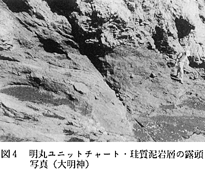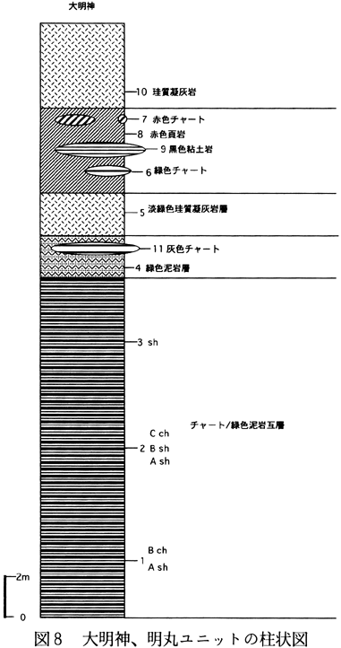 (3)明丸ユニット 明丸ユニットに属する大明神では、下位より、変形したチャートと緑色の泥岩層(9m)、灰色のチャートブロックを伴う緑色泥岩(2m)、淡緑色で数