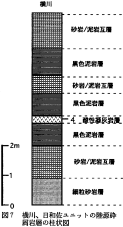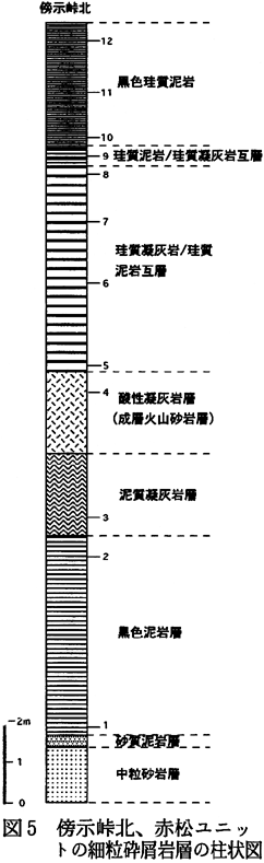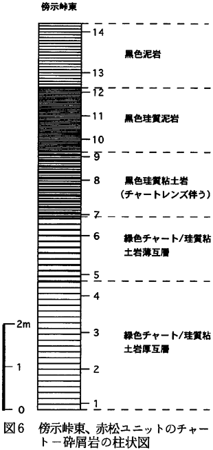 の泥質層からなる。酸性凝灰岩層はレンズ状に変形することがある。緑色岩類は、玄部岩質の溶岩・凝灰岩・凝灰角礫岩からなり、溶岩にはしばしば枕状構造が認められる。粘土岩とチャートいずれの岩類も断片化が著しく、メランジュ状の岩相を示す。 3)岩相層序 各ユニットを構成する岩類は断片化しており、ユニット全体を包括する連続的な層序を得ることは困難である。今回の調査では、各ユニットの特定のセクションにおいて、岩相の整合性・漸移関係をもとに、連続層序を見いだし、微化石による生層序学的検討のための資料採集を行った。 (1)赤松ユニット 日和佐町傍示峠北の古屋川沿いの県道露頭では、図5に示す連続層序が得られた。東西性の走向で北傾斜の中粒の砂岩層(1.5m)の上位に、砂質泥岩(0.3m)の漸移部を挟んで、黒色の泥岩層(5m)が重なり、さらに淡緑色の泥質の凝灰岩(2m)、ラミナの発達した砂粒サイズの成層酸性凝灰岩(2m)、チャート様の淡緑色ガラス質の珪質凝灰岩(10〜20cm)と珪質泥岩(数〜10cm)の互層(5m)、黒色の珪質泥岩(10〜20cm)とチャート様の淡緑色ガラス質の珪質凝灰岩(数〜10cm)の互層(0.5m)、黒色の珪質泥岩(4m)が整合的に累重する。各層の境界は漸移的である。最下部の中粒の砂岩はタービダイト砂岩層の一部であり、最上部の黒色の珪質泥岩は上部がややシルト〜砂質になることから、このシーケンスは、陸源砕屑物中に挟在する細粒層と考えられる。 傍示峠東の日和佐川沿いの県道露頭では、図6に示す連続層序が見られる。ここでは、東西性の走向、北傾斜で、単層が10〜20cm