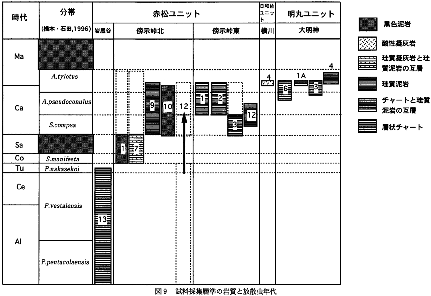 群集帯下部)と新しい。 つぎにこのような比較に最も重要な、同一セクションでの遠洋性堆積物のチャートから陸源砕屑物の泥質岩へ移り変わる岩相境界、すなわちチャートから細粒砕屑岩への岩相境界の年代、あるいは各セクションにおける細粒砕屑岩の出現時期に注目すると、北の赤松ユニットでは、傍示峠北の細粒砕屑岩の出現時期がコニアシアンないしサントニアン(S.