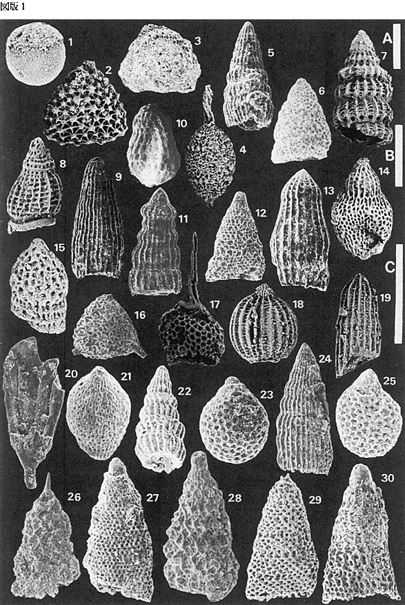 図版説明 図版1 白亜系から産した放散虫化石の走査電子顕微鏡写真。スケールは100μm。A:3,5,9,10-12,16,20,24,26,27.B:1,2,4,6-8,13,14,17-19,21-23,25,28-30.C:15.産地およびサンプル番号.[赤松ユニット]岩屋谷,サンプル13:1.傍示峠北,サンプル1:1,2-4,7.サンプル9:5,6.傍示峠東,サンプル1:8.サンプル2:9,10.サンプル3:12,13.サンプル12:14.[日和佐ユニット]横川,サンプル4:15,16.[明丸ユニット]大明神,サンプル1A:17,18.サンプル2:19.サンプル3:21,22.サンプル4:24-28.サンプル6:29,30. 1.Holocryptocanium