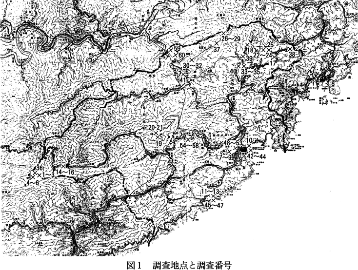 3.調査の方法 調査は1996年7月14、31日、8月1、2日、10月2日、11月23、30日に実施した。調査は、あらかじめ空中写真により群落区分した地点に赴き、確認・修正する方法で行った。調査地点では、森林群落、草本群落ともに、各群落内においてそれらを代表すると考えられる植分について、Braun-Blanquet(1964)の方法により、各階層毎に出現する全ての維管束植物の種類について、被度・群度を測定し、記録した。植生調査をしたのは全体で60箇所(図1)で、これらから表操作により識別種を選び出し、群落を区分した。 これらの調査結果を基にして、1/50,000