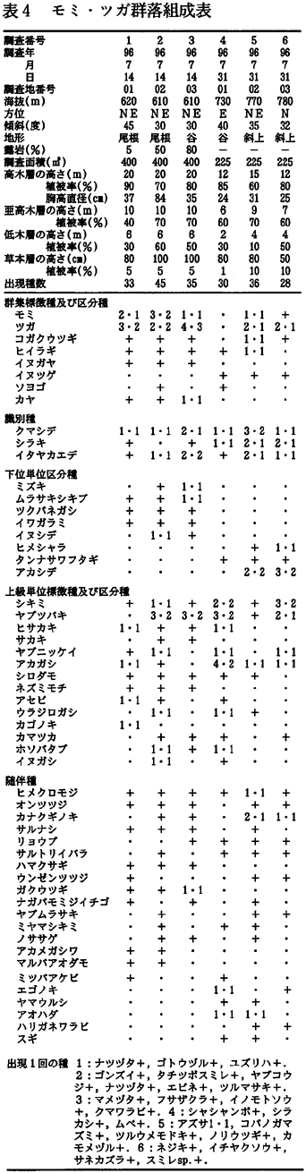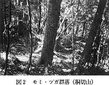 4.調査結果 1)内陸性植物群落 森林について調査した41の植分は、表操作により大きく二つの群落、すなわちモミ・ツガ群落とシイ・カシ群落に区分できた。 モミ・ツガ群落は、下位単位区分種により、さらにミズキ群落とヒメシャラ群落に下位区分できた。シイ・カシ群落は、下位単位区分種によりシイ群落、ウバメガシ群落、ホソバタブ群落、シイ・カシ萌芽林、アカマツ群落、伐採跡群落、さらに人工林のスラッシュマツ植林、スギ・ヒノキ植林、およびモウソウチク林に区分できた。本来ならば、人工林はシイ・カシ群落とは種組成上区分できるはずであるが、永年手入れされずに放置されていることから、林内に自然に侵入した種類が群落構成種として主要な位置を占めるようになり、シイ・カシ群落に含まれるようになったものである(表2)。なお、シイにはスダジイとツブラジイとがあるが、芽生えや幼木の時にこれらを区別することは困難であるため、群落表では両者を区別せず、共にシイとして扱った。 (1)モミ・ツガ群落(図2) モミ・ツガ群落(表4)はコガクウツギ−モミ群集に属するもので、この群集の標徴種としてはモミ、ツガ、コガクウツギ、ヒイラギ、イヌガヤ、イヌツゲ、ソヨゴ、カヤなどがあるが、この群落ではモミ、ツガ、クマシデ、シラキ、イタヤカエデでシイ・カシ群落と識別できた。これはさらに地形、海抜高に対応して、下位単位区分種により二つに区分できた。