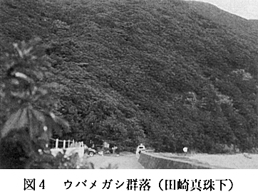 のウバメガシが密な樹冠を形成し、ヤマモモ、タブノキ、カラスザンショウなどを交え、低木層にはヤブツバキ、タイミンタチバナ、トベラ、ヒサカキ、ヤブニッケイ、ネズミモチなどが見られ、草本層は光不足のためあまり発達していないが、ツワブキ、マンリョウ、ヤマイタチシダなどが生育している(図4)。ここのウバメガシ群落はトベラ−ウバメガシ群集に属し、ウバメガシが標徴種である。