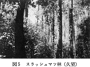 のスラッシュマツのみが、植被率70〜90%の樹冠を形成しているが、亜高木層以下は、シイ・カシ萌芽林の構成種と同じ種類が生育している(図5)。今回植生調査した群落の中で、出現種数が最も多い群落である。