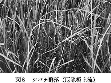 のシオクグが点在している。 2 シバナ群落 下位単位区分種:シバナ。平均出現種数2種。 シオクグ群落が発達する塩沼地の、ヨシ群落より内陸部に近い、干潮時でも水が浅くたまり、よどんだ水の中に見られる(図6)。シバナ群落は、本県では本町のこの付近だけに生育している貴重なもので、今後この群落の管理と保護が望まれる。