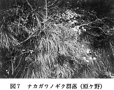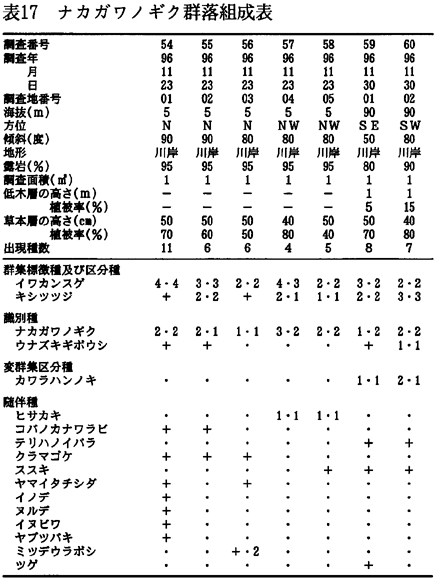イ)ナカガワノギク群落 識別種:ナカガワノギク、イワカンスゲ、キシツツジ、ウナズキギボウシ。平均出現種数7種(表17)。 ナカガワノギクは徳島県の特産種で、川辺の、洪水時には冠水し、平水時には水面上に現れるような生態域を生活の場としている(図7)。花期は11月なので、調査はこの時期を選んで行った。本種は、本来キシツツジが生育する場所に生活域をもっているが、キシツツジが見られてもナカガワノギクは必ずしも生育していない。
