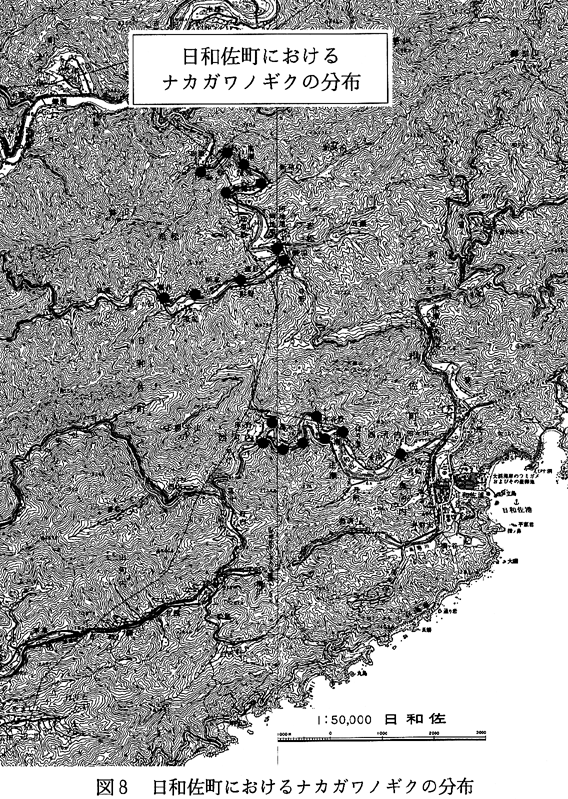 5.ナカガワノギクの分布 ナカガワノギクの花は舌状花が白色で大きく(直径2〜6cm)、野生のキクとしては大型で、良い香りがする。生活場所は前述の通りで、河岸の岩場などに生育している。名前の通り、徳島県の那賀川で発見(1935年)された植物である。その後の調査で、那賀川の上那賀町長安口ダムから相生町、鷲敷町を経て阿南市持井までの間と、赤松川だけに生育しているとされていた。ところが、日和佐川にも生育していることが昭和43(1968)年に分かった。すなわちこのキクは、徳島県の那賀川と日和佐川だけにしか生育していない植物、ということであり、大変貴重である。 日和佐町におけるナカガワノギクの分布地点は、日和佐川では、最上流域は西河内の原ケ野にあり、ここから下流の屈曲部に点在し、西河内の永田と田々川との境界付近までとなっている(図8)。かつて日和佐川におけるナカガワノギクの生育が発見された昭和43年には、原ケ野から下流に、個体数も多く点在し、日和佐川が北河内谷川に合流する井上の左岸まで生育していることを確認できたが、その後の河川改修事業による川岸の護岸工事や、日和佐川の流路変更工事などにより、分布地および個体数が激減した。 なお、原ケ野の分布点より上流について、平戸、落合、西山とナカガワノギクが生育できるような環境の場所を調査したが、生育していなかった。