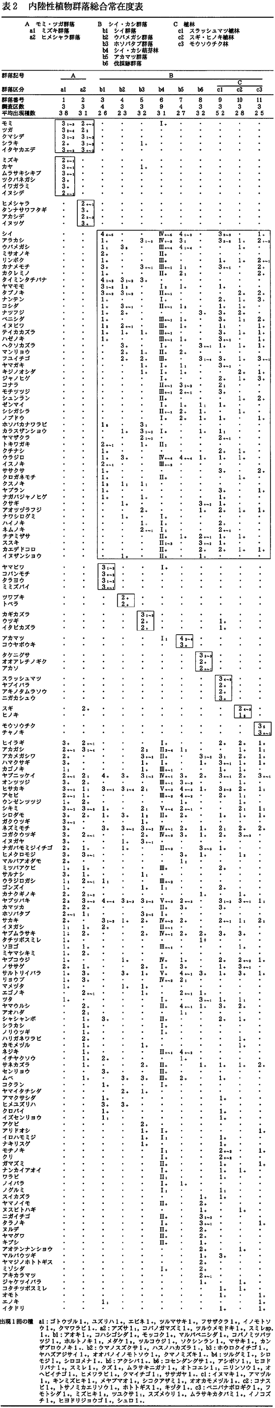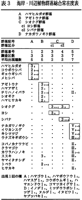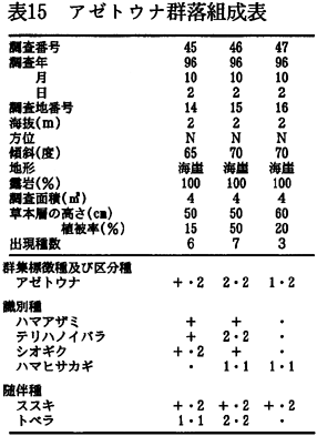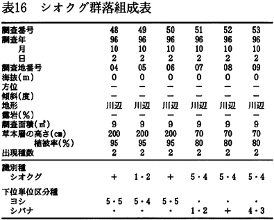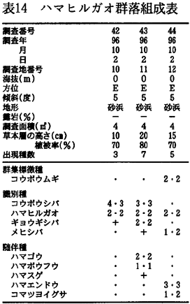 までの範囲にわたるが、最近はほとんど手入れが行われておらず、植林地内には、海抜高や地形によって、それぞれの自然環境が支える群落構成種が見られる。 ウ)モウソウチク林 下位単位区分種:モウソウチク、チャノキ。平均出現種数25種(表13)。 本来、人家近くに食用のために植えられたものであるが、近年は手入れが行われぬ放置状態で、他種の生えるにまかせ、また倒れた竹も多く見られた。林内にはシイ・カシ萌芽林の構成種が多く侵入していた。 2)海岸・川辺植物群落(表3) 海岸や川辺の植物群落は特殊な環境にあるので、内陸部とは異なる種構成の群落である。日和佐町では、塩水のかかる海岸砂浜に発達するハマヒルガオ群落、海岸断崖地に見られるアゼトウナ群落、および汽水域の塩沼地に生育するシオクグ群落、真水の日和佐川や赤松川の岸に特異的に生育しているナカガワノギク群落が識別できた。 (1)海岸植物群落 本町の海岸植物群落は、大浜海岸の砂浜にわずかに見られる海浜砂丘植生としてのハマヒルガオ群落と、海岸断崖地の潮しぶきがかかる岩上に発達しているアゼトウナ群落に区分される。 ア)ハマヒルガオ群落 識別種:ハマヒルガオ、コウボウシバ、ギョウギシバ、ハマボウフウ、ハマスゲ、コウボウムギ、ハマエンドウ、コマツヨイグサ。平均出現種数5種(表14)。 本来徳島県の砂浜に発達する海浜植生は、一般的に汀線に近い方から汀線に平行に、コウボウシバ、コウボウムギ帯、ハマヒルガオ、ハマエンドウ帯、ケカモノハシ帯、ハマゴウ帯の順に帯状に群落が発達している。大浜海岸では、ウミガメの産卵の観察や海岸でのいろいろな遊びなど、人の出入りによる植生の攪乱が激しく、海浜植物群落の発達は極めて悪い。防潮堤のすぐ近くのあまり人為の加わりにくい場所にわずかに群落が見られる。 イ)アゼトウナ群落 識別種:アゼトウナ、ハマアザミ、シオギク、テリハノイバラ、ハマヒサカキ。平均出現種数5種(表15)。 日和佐町では、広い砂浜は大浜海岸だけで、長い海岸線のほとんどは山地が海岸に迫り、千羽海崖に代表されるような急傾斜の断崖となっている。海岸断崖の潮しぶきが常時当たるような場所には、山地や平地に生育する植物は生活できず、こういう環境でも生活できるアゼトウナ群落が発達している。この群落は、断崖の傾斜65〜90度の岩の割れ目などに根を下ろし、厳しい環境条件に耐えられるよう適応して生活している群落である。 (2)川辺植物群落 ア)シオクグ群落 識別種:シオクグ(表16)。 これは、日和佐川の河口の汽水域に発達している塩性湿地群落で、厄除橋の少し上手の右岸の沼地に生育している。シオクグ群落はヨシ群落とシバナ群落に下位区分される。 1 ヨシ群落 下位単位区分種:ヨシ。平均出現種数2種。 シオクグ群落の広がりの中で、水辺に近い区域に発達しており、高さ2m