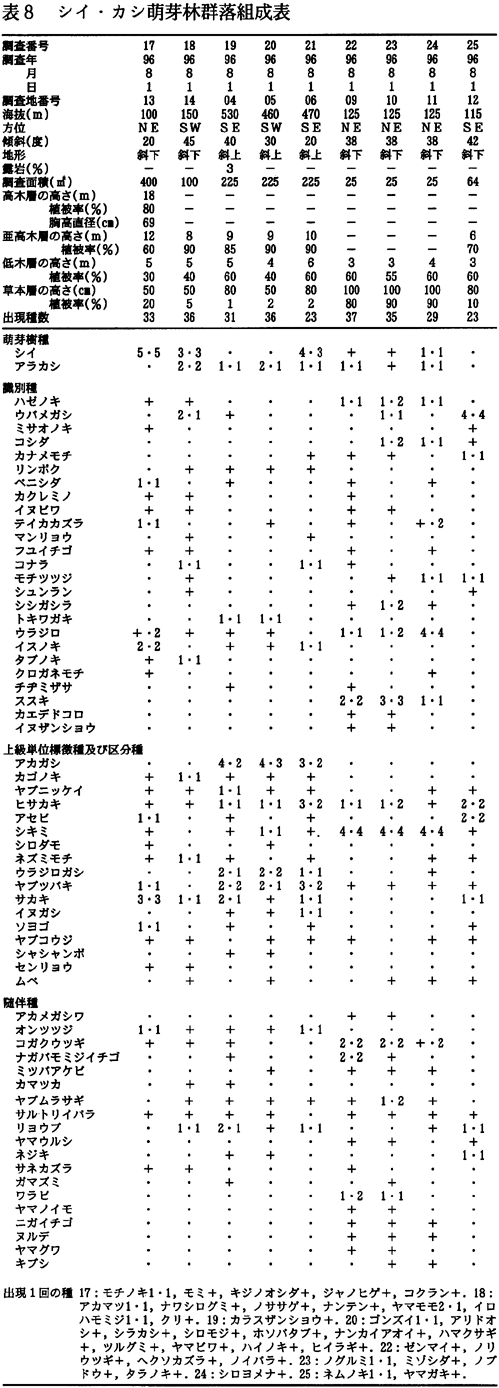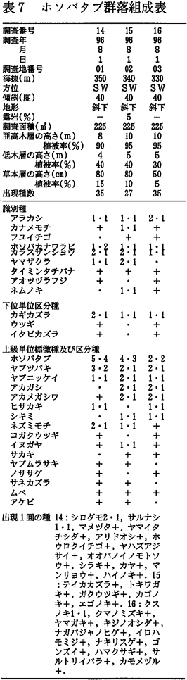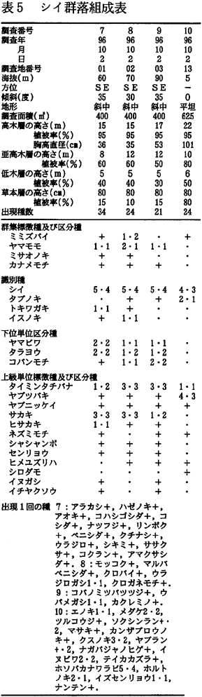 のホソバタブが優占し、ヤブニッケイ、アカガシ、カラスザンショウ、サネカズラ、ヤマザクラ、アカメガシワなどが密に樹冠を形成している。アカメガシワがあることから、かつて伐採され、その後放置されてかなりの年月がたっているものと考えられる。低木層にはホソバタブのほか、ヤブツバキ、ネズミモチ、ヒサカキ、ウツギ、シキミなどが生育しており、草本層にはホソバカナワラビ、コガクウツギ、イタビカズラ、フユイチゴ、テイカカズラ、ナガバジャノヒゲなどが見られる。 エ)シイ・カシ萌芽林 特に下位単位区分種をもたない典型群落。平均出現種数31種(表8)。 本町にはこれに属する群落が広く分布している。これらはかつて薪炭林として利用されていた山林の群落である。伐採されてからの期間により、樹高は3m