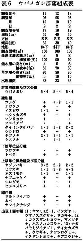 のスダジイ、ホルトノキ、タブノキ、クスノキなどが樹冠を形成している。スダジイは、高木層のほか全階層に出現している。亜高木層はスダジイのほか、ヤブツバキ、タイミンタチバナなどが密に生え、低木層にはヤブツバキが優占するほか、イヌビワ、ヒメユズリハ、ミミズバイ、シロダモなどが見られ、草本層にはホソバカナワラビが最優占し、ソクシンラン、イズセンリョウ、ツルコウジ、ナガバジャノヒゲなどが地面を覆っている。スダジイ−ホソバカナワラビ群集の典型的な群落である。これらのシイ林は本県でも貴重な群落であるので、この状態を維持するようにして欲しい。 イ)ウバメガシ群落 下位単位区分種:ツワブキ、トベラ。平均出現種数23種(表6)。 このウバメガシ群落は、蒲生田岬から南西に伸びる海岸線に沿って、海に面した急傾斜地に発達している自然植生である。常時海からの風を受け、高木層を欠き、ウバメガシがマッキー状に生育している群落である。亜高木層に樹高8m