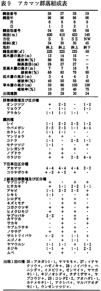 余りとまちまちである。また優占種も場所により異なり、シイ、アカガシ、ウバメガシ、シキミ、ヤブツバキなど様々である。 オ)アカマツ群落 下位単位区分種:アカマツ、コウヤボウキ。平均出現種数27種(表9)。 日和佐町には、赤松という地名があるが、かつてはアカマツがこの地域の山を覆っていたものであろうか。現在では松枯れがひどくて勢力の強いアカマツはあまり見られず、アカマツ群落は、赤松川支流の新発谷の源流付近の尾根にわずかに残っていた。高木層に樹高13〜16m