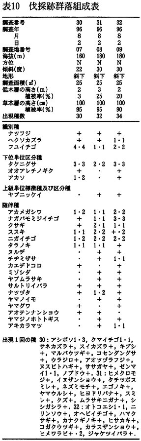なお群落表では、群集標徴種および区分種が識別種と一致する場合は、前者を優先して表示したので、総合常在度表の識別種と群落表のそれとが一致しない場合がある(以下同様)。 ア)ミズキ群落 下位単位区分種:ミズキ、カヤ、ムラサキシキブ、ツクバネガシ、イワガラミ、イヌシデ。平均出現種数38種。 この群落は胴切山の中腹上部、海抜610〜620m