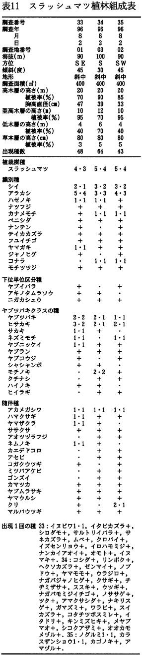 のアカマツが優占しながら、シイやカクレミノを混生している。亜高木層にはウバメガシ、ヤブツバキ、シキミ、アラカシなどの常緑樹のほか、ヤマガキ、エゴノキ、コナラ、ネジキ、ハゼノキ、リョウブなども含み、低木層はオンツツジ、ヒサカキ、ヒメクロモジ、アセビ、カマツカなど、草本層にはウラジロ、サルトリイバラ、シシガシラ、ノイバラなどが生育している。 カ)伐採跡群落 下位単位区分種:タケニグサ、オオアレチノギク、アカソ。平均出現種数32種(表10)。 この群落は、伐採地の海抜高、伐採以前の群落構成種、伐採後の時間などにより、出現する種類や植生高が異なる。 本町内では、いろいろな段階の伐採跡があったが、今回調査したのは海抜160〜180m、伐採後5〜6年の群落である。高木層、亜高木層を欠き、低木層にタラノキ、アカメガシワ、クサギなど伐採跡に特徴的な木本が群落を形成しつつあり、草本層にはタケニグサ、オオアレチノギク、ススキなどの草本のほか、ニガイチゴ、クマイチゴ、フユイチゴ、ノイバラなどの刺をもつバラの仲間が多く出現しているのもこの群落の特徴の一つである。 (3)植林 本町では、スギ・ヒノキの植林面積が広いが、外国産のスラッシュマツ植林もあちこちに点在している。また、人家近くにはモウソウチクの竹林が見られる。 ア)スラッシュマツ植林 下位単位区分種:スラッシュマツ、ヤブイバラ、アキノタムラソウ、ニガカシュウ。平均出現種数52種(表11)。 スラッシュマツは、第二次大戦後、県が外国から苗を輸入して植林を奨励した経緯がある。大戸にあるこの群落では、高木層は樹高20m、胸径40〜50cm