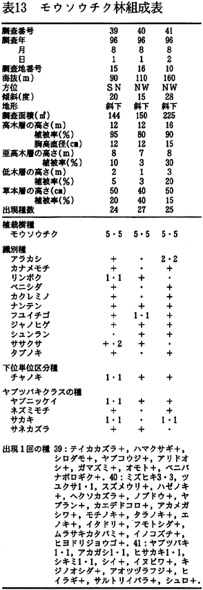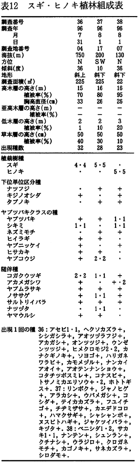 イ)スギ・ヒノキ植林 下位単位区分種:スギ、ヒノキ。平均出現種数28種(表12)。 スギやヒノキの植林は、低地部から町境の海抜900m