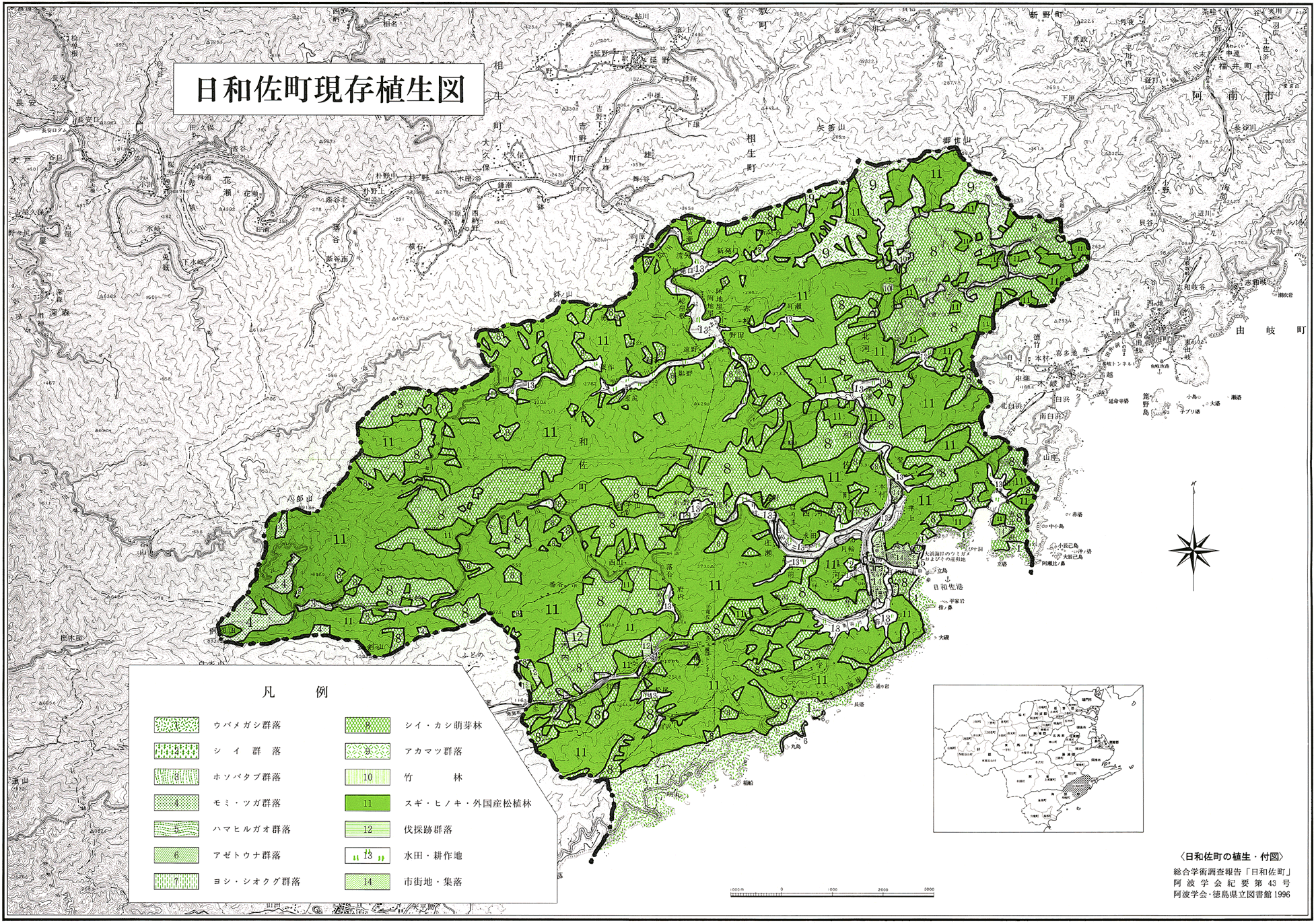 日和佐町は海に面しているが、町の大部分は山地で、森林面積は町面積の9割を占めている。山地部では古くから森林の利用が盛んで、昭和30(1955)年ごろには、薪(まき)・白炭・黒炭等を多く生産していた。しかし、現在では林業が低落したため、森林は放置された二次林、およびスギ・ヒノキ・外国産マツの植林(人工林率は61%)となっている。自然林はわずかに社寺林に残されているだけである。 高度経済成長期には、経済優先・自然破壊の傾向が強い時期が続いたが、現在は人が生活するには自然の多様性が必要であることが認識され、貴重な自然の保全、維持管理、失われた自然の復元が積極的に行われる時代を迎えている。このような将来の町づくりのための基礎資料として、日和佐町の現在の植生を調査し、現存植生図を作成した。