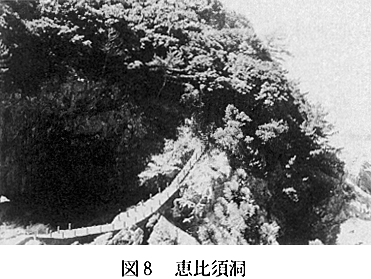 13)新田神社(山河内字大戸) 国道55号から見える新田神社には、予想外に広い社叢がある。よく茂った樹林と古木は神社との歴史の古さを示している。 ウバメガシ(2.99m)は、樹勢よく、樹冠もよく張っている。自生樹では県下1位の太さと思われる。そのほか次のような樹種が、モウソウチクと混生している。 ツクバネガシ(2.35m)、アセビ(0.52m)、サカキ(0.47m)、オンツツジ、ツブラジイ(1.37m・1.45m・1.55m)、イヌシデ(0.92m・0.85m)、オガタマノキ、モミ(1.86m・2.59m)、カクレミノ、タブノキ、カナメモチ、スギ(1.58m)、ヤブツバキ(0.96m)、ウラシロガシ(1.35m)、イロハモミジ(2.46m)その林下には、ハゼノキ、テイカカズラ、モミ、スギ、コウヤボウキ、カクレミノ、モチツツジ、サルトリイバラ、ササクサ、ヤブコウジ、ソヨゴ、チヂミザサ、カナメモチ、シャシャンボ、ヤブツバキ、ウンゼンツツジ、ヤブニッケイ、マツラニッケイ、シキミ、タブノキ、クチナシ、センリョウ、オガタマノキ、ムベ、ネズミモチ、モッコク、ミヤマウズラ、ムヨウラン、ハエドクソウ、シオデなどが見られた。 14)恵比須洞(乾燥地)の植物相 恵比須洞(図8)は、海食によって一部が空洞になり、高波時は洞窟(くつ)内を潮が通り抜ける。海に突き出ているので、その場に降った雨と、夜露が植物を乾燥から守っている。水源から隔離された離島に近い状態では、どんな植物が耐えているかを調べ、記録にとどめて置くことにする。