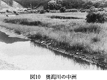 5.湿田・河川植物 1)奥潟川周辺の植物 奥潟川は、干満の差に関係なく中洲ができている(図10)。干ばつ時には表面に亀(き)裂のはいる時もあるが、普通は柔らかい状態にある。ツルヨシが中心であるが、そのほかに次のような植物が見られる。 サンカクイ、スカシタゴボウ、ホウキギク、ヒロハホウキギク、イガガヤツリ、イヌタデ、ヒメガマ、アリタソウ、ギシギシ、ヨモギ、アメリカセンダングサ、オオオナモミ、ヒメムカシヨモギ、クララ、ツルマメ、オトコヨモギ、センニンソウ、イシミカワ、ヒルガオ、ニガカシュウ、セリ、アメリカネナシカズラ、ブタクサ、ヤハズソウ、マツバイ。