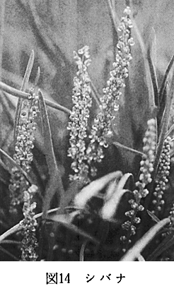 f. 鹿児島県霧島山中に初めて見つけられたのでその名がついた。暖地性のエビネ属で、本県に自生することが珍しい。エビネブームのころに消えてしまい、日和佐町に数株だけが確認されている。 4)シバナ(シバナ科)(図14) Triglochin