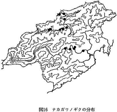 Makino 普通キク科植物は、幾県にもまたがって繁殖するが、ナカガワノギクは徳島県の固有種で、しかも那賀川とその流域の一部、日和佐川の一部にしか生育していない。小川誠・田渕武樹・小松研一の調査によると、日和佐町内の赤松川では、相生町境から日浦橋下流までの8か所、日和佐川では田々川から原ヶ野までの6か所で確認された(図16)。赤松川では群生しているが、日和佐川では、三面張のコンクリートに変わってから細々と生育しているにすぎない。