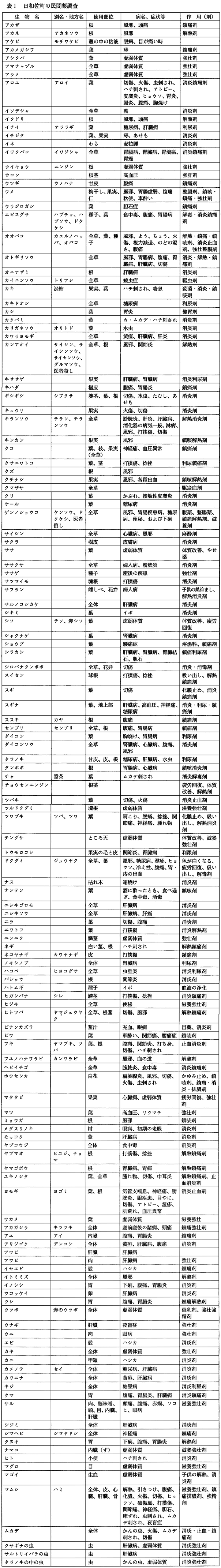 3.調査結果の集計 得られたすべての民間薬について、出現回数に関係なく、民間薬名別で、更に病名あるいは症状別にまとめた。 4.調査結果 調査対象人数は総計157名であった。調査では、植物130種、動物42種、鉱物その他5種、動物に使用する薬6種の計183種の民間薬が得られた。それらのうち、植物と動物の主な物についてまとめた(表1)。そのうち出現回数の多い民間薬はゲンノショウコ63、ドクダミ57、マムシ53、アロエ51、オオバコ45、ヨモギ44、センブリ30、ウラジロガシ21、ユキノシタ18、ミミズ18、カキ(柿)17、アカネ15、スギナ15、オトギリソウ14、ダイコンソウ13、ウメ12、カンアオイ12、タデ12、フキ12、ムカデ11、ヒジキ10であった(数字は出現回数)。 この調査結果の特徴としては、日和佐町が海岸であることを反映して、アラメ、コンブ、テングサ、トリノアシ、フノリ、ワカメなど海藻類が多く見られた。また、植物ではササクサ、チガヤ、ニシキゴロモ、ニシキソウ、ネコヤナギなど、動物ではアリジゴク、カメノテなど、他地域では見られない珍しい民間薬の使用が確認された。