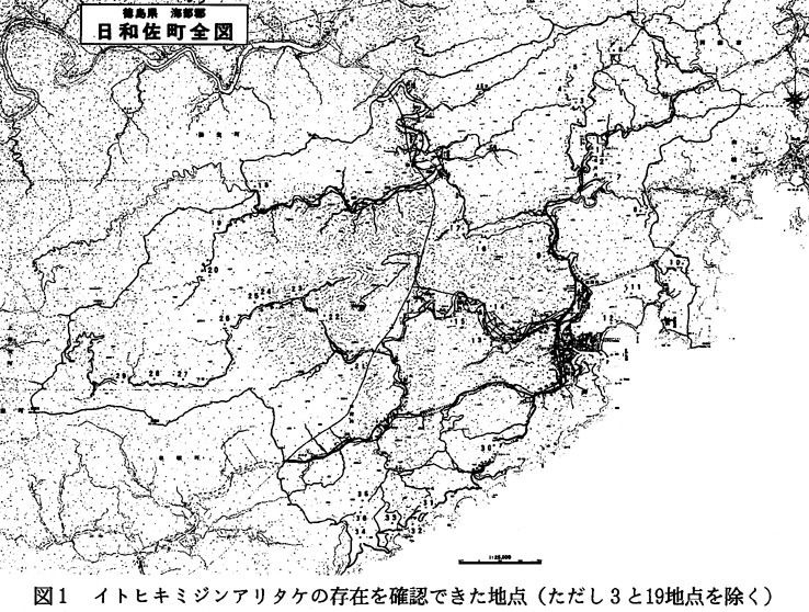3.調査結果 1)イトヒキミジンアリタケの分布状況 調査地点は多く取ったが、ホソバカナワラビの生育がない、イトヒキミジンアリタケの着生がないなどにより、図1に示したように、イトヒキミジンアリタケの存在を確認できた場所は34地点であった。しかし各発生確認地点での発生個体数は一個体しか見つからないという場所はなく、どの地点でも数個〜数十個と多かった。その結果、イトヒキミジンアリタケの分布は広く、日和佐町のほぼ全体に広がって分布していることが判明した。このことはイトヒキミジンアリタケは周年観察されるが、発生地以外ではまれという記載(1)から考えると、日和佐町全域が発生地と断定できる。今回の調査で、新発谷、耳瀬や大戸のように広い面積で分布が確認できなかった地方は、広範囲なヒノキやスギの植林地であり、広葉樹がほとんど見られない地域であった。また、落合、府内のように民家に近く、または大きな樹木が無く、直射日光にさらされている地域もイトヒキミジンアリタケの分布を確認できなかった。しかしいずれの地域も山を越えた反対の谷では見つけることが出来たことから、道路沿いの山野、谷川からさらに山に奥深く入り、丹念に山の中まで探せば発見出来る可能性がある。また、3と19地点はイトヒキミジンアリタケを発見できなかったが、発生条件等を比較検討するために記入した。 イトヒキミジンアリタケの県内最初の発見が、南阿波サンライン沿いの谷であったこと、および徳島県では他地域での発見の報告がされていないこと、上那賀、市場、川島、穴吹での調査で、ホソバカナワラビへの着生が見つからなかったことから、潮風の到達する海岸地帯にだけしか存在しないのではないかと想像していたが、海岸から遠く離れた胴切山の中腹で発見できたことは、潮風などの条件は無関係であり、日和佐町での分布の広さを示している。 イトヒキミジンアリタケは、写真1で示すようにホソバカナワラビの葉の裏面にぶら下がるような形で着生しているが、写真2で示されるように、羽アリにもイトヒキミジンアリタケが発生していた。羽アリの発生期間は短く、またその羽は自然状態では早く脱落すること、および菌糸が羽の付け根の周囲に多く付いていることから、冬虫夏草菌により羽を体に縛り付けられたような状態となっており、アリの体をホソバカナワラビに縛り付けているように菌糸が繁茂していることと合わせて考えると、菌糸の成長速度の速さと合理性をうかがわせた。