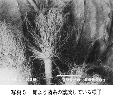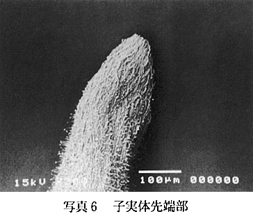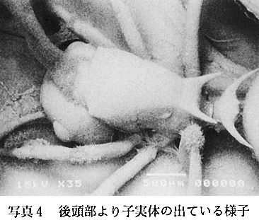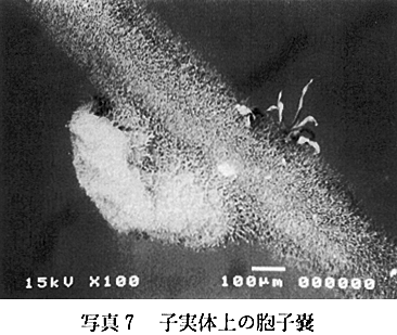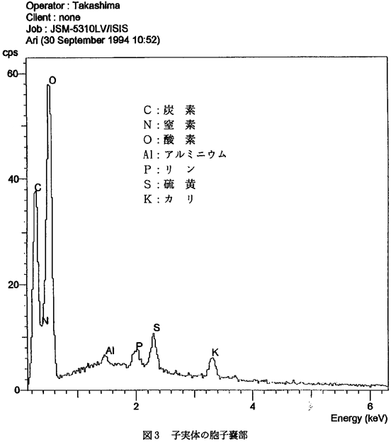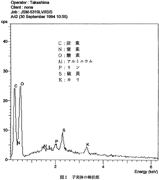 6)イトヒキミジンアリタケの電子顕微鏡像 写真3で示されるように、イトヒキミジンアリタケはホソバカナワラビに菌糸によって強固に結びつけられており、シダの裏面に着生しているイトヒキミジンアリタケが自重および風などによるシダの揺れに対しても脱落せず、一年中その存在を確認できる理由の一端を示している。写真4にイトヒキミジンアリタケの頸部から子実体が出ている状態を示した。これはイトヒキミジンアリタケの子実体の発生場所の特徴でもある。写真5に脚の関節部より菌糸が繁茂している状態を示した。体の軟らかい部分から菌糸が体外に出ているようすが見られる。このことは、冬虫夏草菌が体内に侵入するのは、粘膜や体の軟らかい部分からと考えられているが、その逆に体外へ菌糸が出るのも同様な部分からであることが証明された。すなわち粘膜や軟らかい部分から菌糸が入り、また出ていくことが分かった。写真6は子実体の先端部の状態である。先端から少し離れた場所には胞子が多数存在するのが見える。しかしこの胞子は、形状から二次寄生した他の菌の胞子の可能性がある。写真7に子実体の結実部のようすを示した。開口部も確認できる。また図2には子実体の棒状部、図3には結実部の炭素、窒素、酸素、アルミニウム、リン、硫黄、カリウム量の電子顕微鏡による測定値を示した。この二つの図から、結実部は棒状部と比べ酸素および炭素が非常に多くなっており、それ以外は硫黄に少量の増加は見られるものの、他の元素にはほとんど差が見られなかった。このことは結実部は菌糸が集まっただけの子実体組織とは異なることがわかった。結実部では胞子などを作っているため、炭素、酸素、硫黄が多いのではないかと思われるが、この解釈の当否は胞子や活動の終了した結実部などの元素の測定を待ちたい。写真8〜10で示されるように、アリの体に付着している胞子が数種見られること、および写真6で見られる胞子と形態が違うこと、原色冬虫夏草図鑑に記載の二次胞子と形状が違うことなどから、他の胞子が付着している可能性が考えられる。また一方、イトヒキミジンアリタケは単一種の菌糸で構成されているのではない可能性も考えられ、イトヒキミジンアリタケの培養による菌の純粋化など、今後さらに検討する必要がある。