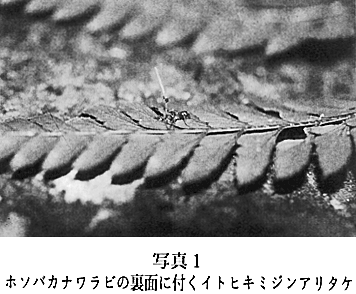 の範囲(方形に近い不定形)中に生えているすべてのホソバカナワラビを、ほぼ1カ月置きに調査し、その葉の裏に付いているイトヒキミジンアリタケの数とホソバカナワラビの本数を調査する方法をとった。調査期間は1997年6月19日〜9月8日まで1カ月置きに4回と、12月14日である。