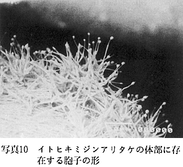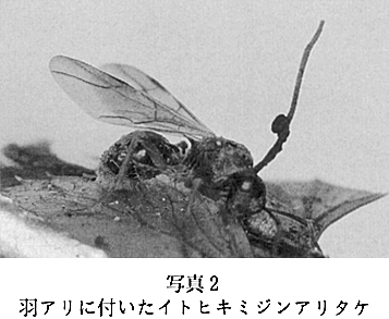 を、フウノトウまたは夏草冬虫の名で肺結核や肋膜の秘薬として市販していた、との記載が1879年に書かれた「筑後地誌略」にある。 今回は、多くの冬虫夏草類の中で、徳島県で比較的採集しやすいこと、アリが薬用として使用されることがあることなどから、薬用にできる可能性が高い冬虫夏草の一種、イトヒキミジンアリタケの分布、発生の時期及び形態について調べた。 今回の調査の対象となったイトヒキミジンアリタケは、アリに寄生し、気生型、すなわち地上で植物等についた動物体に発生する。結実部は背着性の円盤型である。子実体がアリの頚(けい)部に生じるのが特徴で、1989年東舞鶴の低山地で、小西思演氏によって採集され、また、三谷進氏による香川県及び神戸での採集の記録がある(1)。 徳島県におけるイトヒキミジンアリタケの存在は、南阿波サンラインの一つの谷でホソバカナワラビ