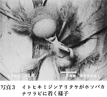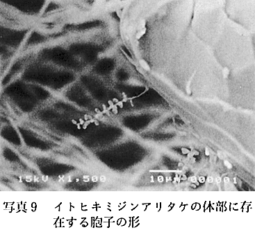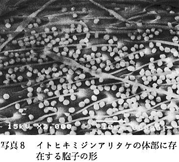 4.まとめ イトヒキミジンアリタケは日和佐町の広い範囲でその発生が確認でき、ホソバカナワラビが生育していれば、谷の向き、周囲の樹種、高度に関係なく発生することが判明した。またその発生は夏から秋にかけて多いことが判明した。この調査以前の調査結果を含めると、一年中観察できることが確認できた。さらに、那賀川以北ではホソバカナワラビへの着生がほとんど見られないことからも、日和佐町はイトヒキミジンアリタケの大発生地といえる。調査した地点の内、発生量の多い地点では16〜25%のホソバカナワラビにイトヒキミジンアリタケが着生していた。このことは注目にあたいする。 またその電子顕微鏡像についても検討した結果、菌糸がアリとホソバカナワラビの葉の両方に伸びて組織に侵入しており、アリが脱落しない理由の一部が解明できた。また、アリには胞子が数種付着しているのが見られ、子嚢胞子との比較の必要性を感じた。 日和佐町におけるイトヒキミジンアリタケは、すべてトゲアリに寄生していた。このことは、すでに報告されている香川や神戸のイトヒキミジンアリタケがムネアカアリに寄生しているのとは異なることが判明した。この原因についても調査する必要がある。