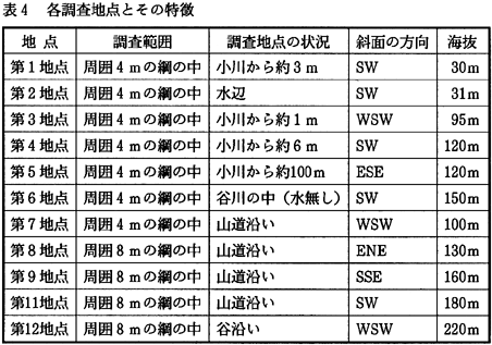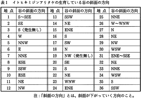 2)イトヒキミジンアリタケの生育している谷の斜面の方向 谷の斜面の方向とイトヒキミジンアリタケの発生に、相関関係があるか否かについて調査をしたところ、表1に示したように、斜面の方向が東西南北のいずれの方角でもイトヒキミジンアリタケの生育を確認でき、谷の斜面の方向が、イトヒキミジンアリタケの生育の条件にはなっていないことが判明した。すなわち、ホソバカナワラビが生育するという条件があれば、イトヒキミジンアリタケも生育が可能であることがわかった。なお参考までに発生の無かった3、19地点の谷の斜面の方向も示した。