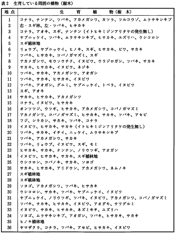 3)イトヒキミジンアリタケ生育地周囲の植物(樹木)の種類 イトヒキミジンアリタケの発生に、周囲の樹種が影響を与えているかどうかについて調査した。その結果、表2に示すように、周囲の樹種は広葉樹が多い場所であることが判明した。このことは、冬虫夏草が広葉樹林で発生するといわれていることと一致する(1)。 しかし一方では、久望(5)、大越(27・28)、白沢(35)の山中のように、スギやヒノキの植林地内でもイトヒキミジンアリタケの生育が見られた。このことは、一般にいわれている冬虫夏草の発生場所の条件とは異なる。この理由として考えられることは、これらの発生場所周囲は、スギやヒノキ等の針葉樹しか生育していないものの、発生場所から100〜300m