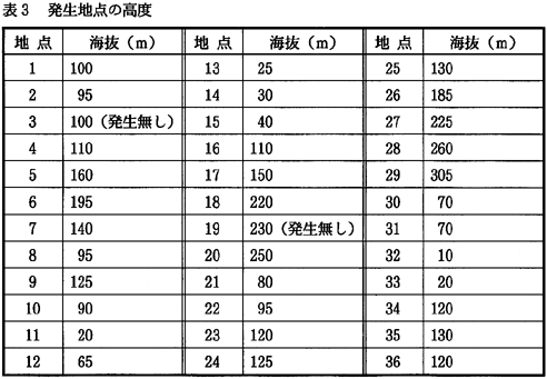 4)高度とイトヒキミジンアリタケの発生との関係 イトヒキミジンアリタケの発生に、高度が影響を与えるか否かについての調査を行った。その結果、表3に示すように、海抜10m