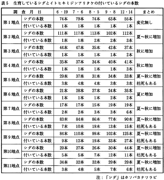 (2)調査結果 まだ調査開始後1年を経過していないため、断定は出来ないが、表5に示すように、夏から秋にかけての発生が多い。今後、春における発生の有無を見る必要がある。また、低地よりも高地での発生率が良かった。 なお、9月の調査時点でも、また12月の調査時点でもイトヒキミジンアリタケの付いているホソバカナワラビが枯死し、それにつれて減少しているのにかかわらず、新たなアリタケが付いているのが見られた。例えば、第8地点では8月の1本、9月に3本、12月に2本のホソバカナワラビの枯死による脱落が、10地点では12月に2本のホソバカナワラビの枯死による脱落が、11地点では9月に1本のホソバカナワラビの枯死による脱落が見られた。しかし、枯れていないホソバカナワラビに付いているイトヒキミジンアリタケの脱落は見られなかった。枯死による脱落はこの調査では付いている本数に含まれていないため、この枯死によって脱落した数を考慮すれば、第5地点および第8地点〜第11地点で12月までに発生したイトヒキミジンアリタケの総数は、12月の着生数よりさらに多いことになる。またイトヒキミジンアリタケの付いていたシダの本数を調査範囲の中に生育しているシダの数で割った着生率をみると、8・9・10・11地点では、16〜25%のシダにイトヒキミジンアリタケが着生していることになり、非常に高密度の着生率であることが判明した。 ほぼ1カ月置きに調査をしたが、前回に見られなかったシダに着生しているアリに青白い子実体がすでに伸びている例がみられ、その生長の速さについて調査する必要性を感じた。