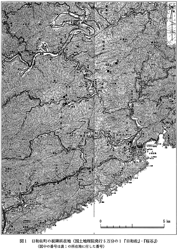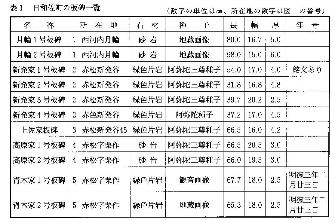 1.はじめに 日和佐町では、古く石斧(せきふ)が採集されたことは記述されている注(1)が、それ以外で目立った遺跡は知られていない。そこで、今回の総合調査でも昨年に引き続き、中世の庶民信仰の遺物である板碑をテーマにすることにした。 板碑は、中世の石造供養塔婆の一形式で、江戸時代以来の伝統的名称である。日本における石造供養塔婆の造立は、平安時代末期から中世にかけて全国的に普及する。形態は、五輪塔、宝篋印塔(ほうきょういんとう)、笠(かさ)塔婆など数種類におよび、板碑もその一つである。その特色は、第一には簡単な形態を示す点、第二に本尊や銘文などを一方の面に表すという平面性、第三に1個の石材により作られている点が挙げられる。これらから、板碑は石造供養塔婆の中で最も簡略な形態を示し、最も簡単に造立しうる形式であり、そのため板碑に適した石材の得られる地方では、他の石造供養塔婆を圧して広く普及した。徳島県内では、緑色片岩が板碑の石材として広く利用され、鮎喰川流域に分布の中心がある。 日和佐町では、板碑に適した石材が入手しにくい地域でありながら、板碑が多く造立されている。しかも、遠く離れた地域からの入手としか考えられない緑色片岩の板碑が多いのも特色である。こうした板碑が日和佐町にどう分布するのか、前述の特色等とも関連させて明らかにしたい。また、日和佐町では文化財地図を作成し、その中に石造文化財も含めた文化財の位置が示され、写真が掲載されている。さらに、日和佐町内の石造物の調査を実施し、『日和佐文化財めぐり(石造物等)』(日和佐町教育委員会、1990年3月)にまとめられている。この