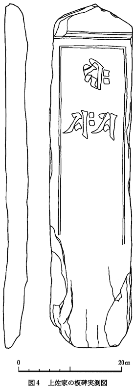 (3)上佐家の板碑(図4) 新発家との対岸をさらに上流へ上った突き当たりの段丘上、上佐家屋敷裏に所在する。一石五輪塔2基と並んでいる。板碑は、長さ66.5cm・幅16.0cm・厚さ4.2cm