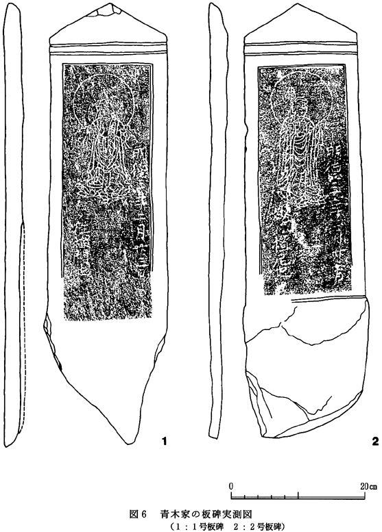(5)青木家の板碑(図6) 高原家から赤松川を下流に下った南岸でやや開けた地に水田が広がり、その一段上に青木昭夫家がある。青木家の裏庭の木製の祠の中に2基の板碑が安置されている。2基とも緑色片岩製で、保存状態もよい双式板碑である。2基の板碑を仮に1・2号板碑と呼ぶことにする。 1号板碑…長さ67.7cm・幅18.0cm・厚さ2.5cm