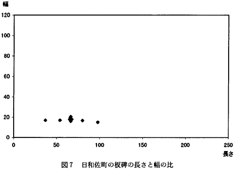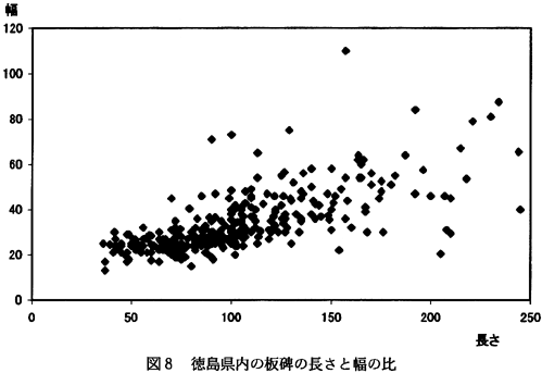 3)日和佐町の板碑の特色 赤松地区を中心に分布している。赤松地区は、赤松川沿いに那賀川にでるので、那賀川流域としてとらえることができる。相生町でも1基板碑が確認されており、関連がうかがえる。 日和佐町の板碑の特色の一つは、石材である。西河内と赤松地区の高原家の板碑は砂岩製であるが、他は緑色片岩製である。日和佐町は、地質的には秩父帯に属し、砂岩と泥岩の互層から成っている。砂岩製の板碑は現地での石材入手はたやすい。これに対して緑色片岩は、鮎喰川流域まで行かないと入手できない。しかも、緑色片岩製の板碑は総じて種子や線刻が精巧で美しい。特に、青木家の双式板碑は非常に精巧な線刻表現がとられている。これらの点から、この地域で製作したものと考えるよりも、板碑製作の盛んな地域からの流入と考える方が妥当であろう。 なお、県南部における板碑の石材をみてみると、阿南市が砂岩5例・緑色片岩31例、由岐町では砂岩1例・安山岩1例・緑色片岩1例となっている。日和佐町は砂岩4例・緑色片岩7例である。つまり、これらの地域の板碑の石材である緑色片岩は、三波川帯の周辺から入手しなければならない。原石を入手して加工したのか、前述のように製品を入手したのかは定かではない。しかし、入手しなければならない理由があったのは事実であり、この理由を考察することも重要である。 特色の第二は、長幅比の小さい板碑が多いことである。表1をもとに長さと幅のグラフを描くと図7となる。図8の徳島県のグラフと比較すると、幅がかなり小さいことがわかる。また、徳島県内の場合、大きさにばらつきはあるが、基本的には長さ:幅が3:1のライン上にのってくるものが多い。これに対して、日和佐町の板碑は、長さにはばらつきが多いが、幅が15〜20cm