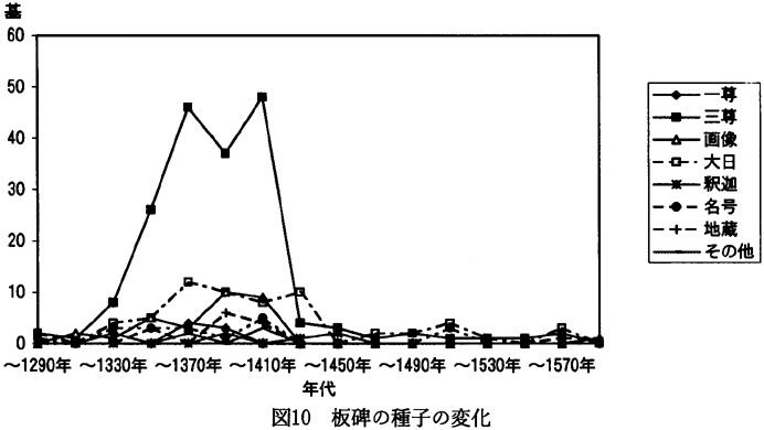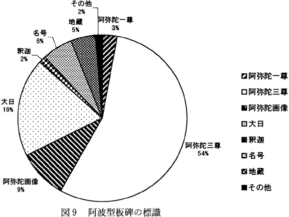 3.阿波型板碑にみる民衆の信仰 1)標識 阿波型板碑の信仰標識を分類してみると、図9のようになる。これを見ると、阿弥陀信仰が最も多く、種子・名号・画像を合計すると、72%を占める。次いで、大日種子・地蔵画像の順となる。この標識こそ、板碑造立者の信仰対象を示しており、阿波型板碑が阿弥陀信仰に支えられていることを物語っている。 さらに、種子の比率の変化を20年ごとにグラフで表現すると、図10になる。阿弥陀三尊が圧倒的に多いが、それも時期的にピークがあることがわかる。1450年以降になると、対照的に大日信仰が増加することもわかる。
