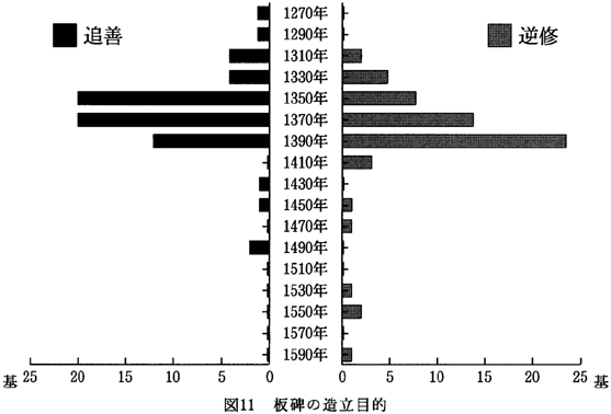 2)造立目的 何を契機に造立するのかを願文から分析した。大きく追善と逆修に分け、20年ごとに集成したのが、図11である。これから、最初は追善目的(例えば、三十五日、五七日、百ヶ日、十三廻忌、三十三廻忌等)で造立され、供養者が功徳の七分全得のために予修とする逆修が増加することがわかる。七分全得とは、死後に追善供養した場合故人に与えられるのは一分、残りは追善を行った者の得分のことで、1337年に初出する。追善は1350〜1390年代にピークがあり、逆修は徐々に増加傾向をたどり、1390年代にピークを迎える。15世紀以降は全体の造立数も激減するが、若干逆修が多い。