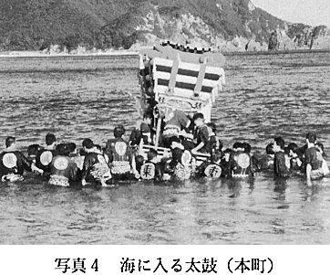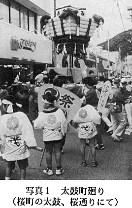 3.祭りの過程 1)準備 祭りの1週間前を「一ノ宮」といい、この日から祭りの準備を始める。各町では、当屋の近く、または神社境内の太鼓小屋で太鼓たたきの練習を始める。祭り前日の10月8日に、総代は氏子青年会の協力を得て、御旅所の設置・幟(のぼり)立てなどの作業を行う。 2)第1日 10月9日(宵宮) この日の主な行事は、8台の太鼓が日和佐町内(日和佐中心部の7町)を巡行する「太鼓町廻(まわ)り」である。各町の太鼓は正午にそれぞれの当屋の元を出発し、あらかじめ決められた巡行ルートに従って町内全域を回る(写真1)。太鼓には中に打子4人(中学生)が乗り、宿老数人がザイを振りながら先導、太鼓若衆30人あまりが引いて歩く。太鼓は町内の一軒一軒を回り、お花(祝儀やお酒)を受け取る。お花は祭りの運営費の一部に当てられる。太鼓はゆっくりした調子で打たれるが、お花を出した家の前では、宿老のザイ振りの合図とともに急調子になり、「サッセー、サッセー」(差せ、差せの意か)の掛け声とともに、太鼓の下に付けられた車輪を軸として、太鼓を前後に大きく揺さぶってお礼をする。町の隅々を回り歩く太鼓町廻りは、地域の人々の間のコミュニケーションを深めるよい機会となっている。