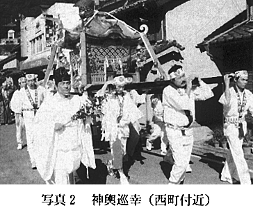 町内を一巡した太鼓は、午後5時を過ぎたころから順次神社に戻ってくる(宮入り)。太鼓は「サッセー、サッセー」、「イッサンジャー」(勇ましいの意か)の掛け声とともに神前で激しくもんだ後、各町の太鼓小屋に納められる。境内には20軒あまりの露店が立ち並び、人でごった返している。 夜は境内で、巫女(みこ)姿の小学生による豊栄(とよさか)の舞・浦安の舞の奉納(6時20分)、子供相撲の奉納(6時40分)、氏子青年会主催の演芸大会(7時)、奉納花火(9時)など、一連の奉祝行事が行われる。 3)第2日 10月10日(本祭) 午前7時より、神社本殿にて例祭(神事)が行われる。総代など約30名が参加する。 午前7時40分、神輿廻祓(かいふつ)。神前に各地区選出の神輿担ぎが集合、御神酒を拝飲。神輿のお祓(はら)いが終わったところで、神輿に御霊(みたま)(御神体)を遷(うつ)す「御霊遷し」の儀が行われる。 午前8時30分、神輿が巡幸に出発。神前を出発した神輿は、境内瑞亀閣前に設けられた舞台の前に進み、豊栄の舞の奉納を受ける。その後、参道を大鳥居方面に直進し、大鳥居を出たところから右へ曲がり、町内巡幸に入る(写真2)。行列の構成は以下の通り(カッコ内は今年度の担当地区)。大太鼓(外磯町)→案内役(弁才天)→塩祓(田井)→榊(さかき)祓(寺込)→天狗(奥潟)→社旗(戎浜)→太刀持(東町)→奏楽(戎町)→神輿(神輿担ぎ14名)→守護(中村町)→警護前(本町)→警護後(井上)→金幣(奥河町)→御鏡餅(桜町)→御神酒(西町)。大太鼓は先触れで、その音を聞き、町の人たちが祝儀を持って出てくる。行列は町内をくまなく巡り、午前10時30分、神社に帰還する。