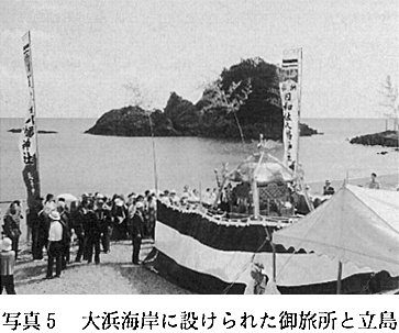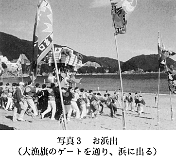 4.まとめ―「お浜出−お入り」儀礼の意味するもの 以上、日和佐八幡神社祭礼の過程を簡単に紹介してきたが、最後に、この祭礼のもっとも重要な構成要素である、「お浜出−お入り」儀礼の持つ意味について検討を加えておきたい。 第一に、お浜出では、神輿や太鼓が海に入っていくが、この種のいわゆる「浜降り」儀礼に「潮による禊(みそぎ)」という意味があることは、すでに多くの研究者が指摘しており(参考文献2など)、また現地でもそのような説明がなされている。 第二に、人の住む世界(里)を此(し)界とすれば、海は神の住む他界と考えることができる(いわゆる海上他界観)。神輿・行列・太鼓の出入りに大漁旗で作られたゲートが使われること、御旅所が、海神を祀った立島の正面に設けられること、その島(に象徴される海の彼方の他界)に向かって大漁航海安全の祈願がなされることなどから考え合わせると、これら一連の儀礼を、他界(海)から此界(里)へと豊穣(ほうじょう)(幸)を呼び込むことを目的とした儀礼とみることもできる。「お浜出−お入り」の儀礼が、浜辺という、此界(里)と他界(海)の境界で行われる必然性もそこにある。 すなわち、「お浜出−お入り」の一連の儀礼には、八幡神社の神霊が、海の潮によって一年のケガレを落とし霊力を更新するという意味と、海の彼方の他界から人々の生活する此界へと豊穣(幸)を呼び寄せるという意味の、二つの意味が含まれていると考えることができるのである。