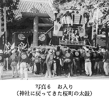 午後2時、煙火を合図に「お入り」が始まる。「お入り」とは、神輿、およびそれに供奉する行列や太鼓(および子供神輿)が神社に還御することをいう。まず神輿が御旅所を出発し、その後に行列が続く。お浜出のときと同様に、神輿や行列は波打ち際を通り、再び大漁旗の間を通って神社に戻っていく。神社の舞台では豊栄の舞が舞われ、帰還を祝福する。舞に続き、総代が拍手で神輿を出迎える。神輿の御神体を、神社に戻す。 続いて、20〜30分ほどの間隔で、各町の太鼓が、お入りのときと同じ順序で、次々と神社に戻っていく。太鼓は、浜辺の所定の安置所から、波打ち際を通り、大漁旗の間を通って神社に戻る。お浜出のときと同様、帰路も海に入っていこうとする太鼓があるが、宿老たちは太鼓をぬらすまいと、懸命に太鼓の引き綱を引っ張って誘導する。 境内に戻ってきた太鼓は、激しく荒れる。神前に走りながら突っ込んできて、担ぎ手は「サッセー、サッセー」の掛け声とともに太鼓を高々と差し上げ、神霊に敬意を示す(写真6)。次いで太鼓は舞台の前に進み、豊栄の舞と総代たちによる出迎えを受ける。その後、太鼓はさらに境内を練り歩き、境内社と、すでに到着している太鼓に対して、掛け声を上げ、太鼓を差し上げて帰還の挨拶(あいさつ)をする。最後に自分の町内の太鼓小屋の前に行き、気勢を上げた後、太鼓を納める。その後も、すべての太鼓が神社に戻ってくるまで、太鼓をたたき続ける。太鼓の音が幾重にも重なって、周囲に活気あふれる空間を作りだしている。 午後5時30分、すべての太鼓が神社に戻り、それぞれの小屋に納められる。無事祭りが終了したことを祝い、神前で一番太鼓責任者による手打ち式が行われ、「日和佐八幡神社万歳」を三唱し、祭りの全過程が終了する。