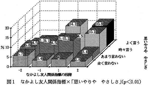 3)友人関係指標と日常生活、家庭生活、学校生活、あなた自身との関連 「日常生活」「家庭生活」「学校生活」「あなた自身」のそれぞれの分野での質問と四つの友人関係指標とのクロス集計から、有意差があったものをここで検討する。 「日常生活」分野では、四つのいずれの友人関係指標とも有意差は見られなかった。 「家庭生活」分野では、家庭でのしつけと家庭での話題についての質問に有意差が見られた。 このクロス集計(図1)から家庭で、「思いやりや やさしさ」について言われている子どもたちの場合、なかよし友人関係指標のプラス1、2段階に全体の39.7%、マイナス1、2段階に14.7%と、プラス段階にたくさんいることが分かる。一方、家庭で「思いやりや やさしさ」について言われない子どもたちでは、なかよし友人関係指標のプラス段階に全体の20.4%、マイナス段階に25%と、マイナス段階が、プラス段階を上回っていることがわかる。つまり、家庭で友だちに対して思いやりややさしさについて話をされている子どもは、友だち関係を築く時に肯定的、相互的な友人関係を持とうとする傾向が強いということである。もちろんやさしさや思いやりについて話をされたからといって、すべての子どもが友人関係で肯定的、相互的な友人関係を持つわけではない。また、家庭で思いやりややさしさについて話をされていなくても、肯定的、相互的な友人関係を築く子どももいるのである。しかし、家庭で「思いやりや やさしさ」について言われている子どもは、言われていない子どもよりなかよし友人関係(肯定的、相互的友人関係)を築く割合が高いと言える。