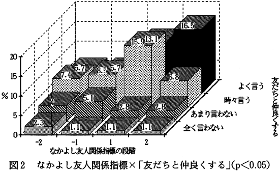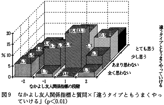 なかよし友人関係指標と「違うタイプともうまくやっていける」との間に有意差(p<0.01)があった。図9を見ると、「違うタイプともうまくやっていける」に対して、肯定的に答えている子どもたちの場合、なかよし友人関係指標のプラス段階の子どもたちとマイナス段階の子どもたちを比べてみると、プラス段階の子どもたちの方が割合が高いことが分かる。一方、「違うタイプともうまくやっていける」に対して、否定的に答えている子どもたちの中で、なかよし友人関係指標のプラス段階の子どもたちとマイナス段階の子どもたちを比べてみると、差は大きくないことが分かる。このことから、「違うタイプともうまくやっていける」に対して肯定的に答えている子どもたちの場合は、なかよし友人関係指標のプラス段階の子どもたちの方がうまくやっていきやすいであろうが、なかよし友人関係指標のプラス段階にいるからといって、いろんなタイプの子どもたちと必ずしもうまくやっていけるとは、言えないであろう。また、差があまりないということは、なかよし友人関係を持っている子どもたちで構成される仲間集団が、気の合う子どもたちだけで集まっており、あまり開放的でないことを意味しているのかもしれない。