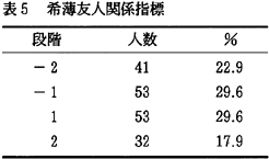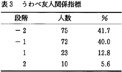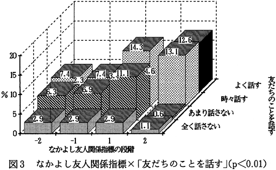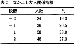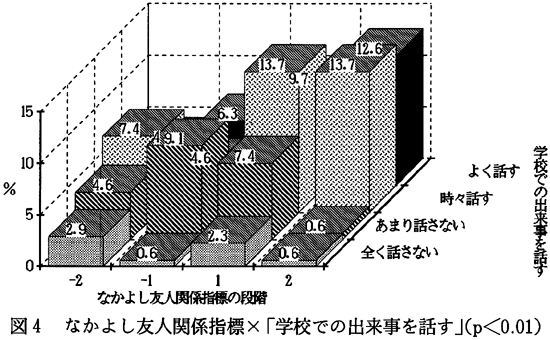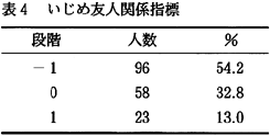 因子1の意味内容を明らかにするため、因子負荷量が0.5以上の項目を取り出してみる。「友だちグループの中ではみんな気が合う」「協力し合う」「悩みをお互い話す」「今の友だち関係に満足している」「友だちグループの中で自分の意見が受け入れられる」。これら5項目は、自分たちのグループ仲間を肯定的に見ており、また相互的な関わりをしている。そこで、この因子1を「なかよし友人関係指標」と名付ける。 因子2の意味内容を明らかにするため、因子負荷量が0.5以上の項目を取り出してみる。「メンバーが少ない」「一緒に過ごす時間が少ない」「他の人の陰口やうわさ話が多い」「お金使いが荒くなる」。これら4項目をみると、友だちのメンバーが少ないことや、一緒にいる時間が少ないことなど、友だちの輪の広がりがないことが表れている。また、人の陰口やうわさ話といった、否定的なことでつながりを持つ友人関係である。そこで、この因子2を「うわべ友人関係指標」と名付ける。 因子3の意味内容を明らかにするため、因子負荷量が0.5以上の項目を取り出してみる。「友だちグループの中で決まった子にいつも用事を頼む」「友だちグループの中で決まった子がいつもからかわれている」「友だちグループの中でからかいがあり、やられる子がよく入れ替わる」。これら3項目をみると、いじめ的要素が感じられる友だち関係である。そこでこのような友人関係を「いじめ友人関係指標」と名付ける。 因子4で0.5以上を見てみると、「友だち関係がよく変わる」「友だちと遊ぶときは、前もって約束をする」の2項目があげられる。これら2項目からは、子どもたちの流動的な友人関係が読みとれるので、「希薄友人関係指標」と名付ける。 このように子どもたちへの16項目を因子分析することで、「なかよし友人関係指標」「うわべ友人関係指標」「いじめ友人関係指標」「希薄友人関係指標」の四つの友人関係指標が抽出された。つぎに、これら四つの友人関係指標を「とてもそう思う」に2点、「少しそう思う」に1点、「あまり思わない」に−1点、「まったく思わない」に−2点を与え、各指標を得点化した。この得点化したものを他の項目とクロス集計しやすくするために、−2、−1、1、2の4段階に分類した(表2、3、5)。いじめ友人関係指標は、3段階とした(表4)。